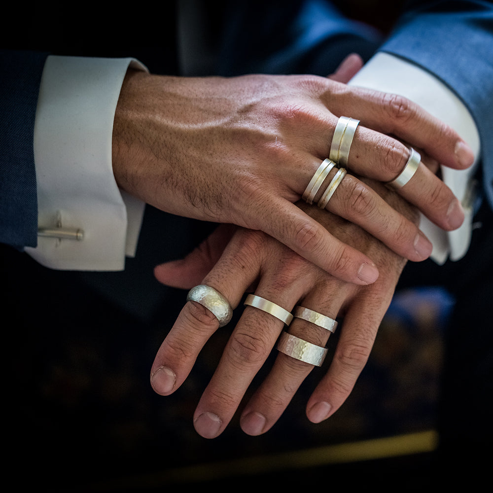 This beautiful ring has exceeded our expectations, it is just what we wanted. Unique and very tasteful, the hammer finish offers a brilliance to the ring that is really eye catching. We are both very pleased with our purchase, the problem will be waiting until the wedding before wearing it!